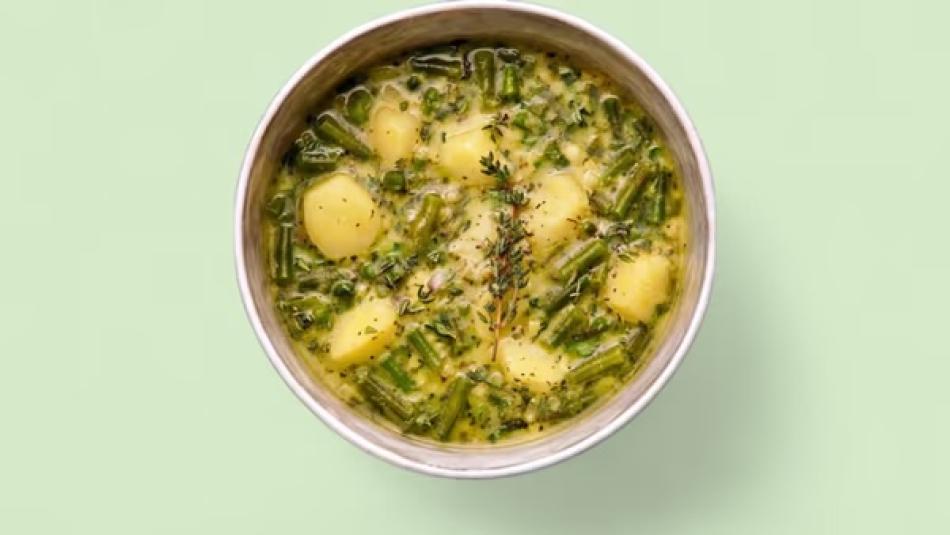 Traditionelle luxemburgische Suppe mit grünen Bohnen, Lauch, Zwiebeln und Kartoffeln – Glutenfrei. Für die ideale Temperatur empfehlen wir, die Suppe 2–3 Minuten in der Mikrowelle zu erhitzen.