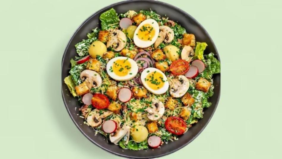 Salat, Kirschtomaten, Ei, Champignons, Kartoffeln, Speck, Gruyère-Käse, Zwiebeln, Vinaigrette