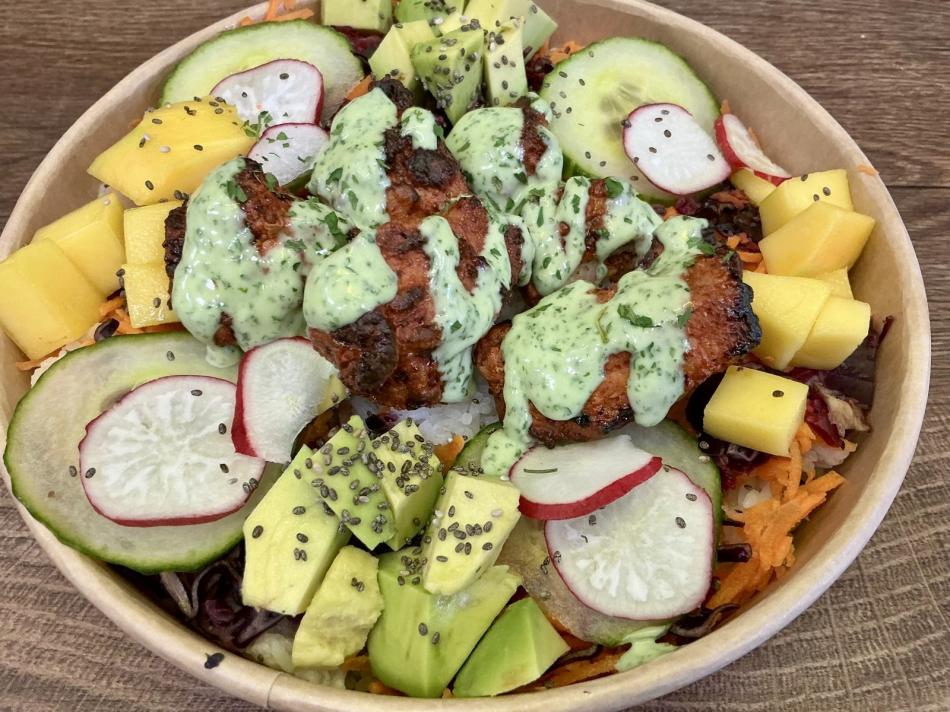 Duftender Reis, hausgemachte süß-saure Soße, Karotten, Gurken, Radieschen, Avocado, Halal-Tandoori-Hähnchen, grüne Soße mit Petersilie, Knoblauch und Sahne.