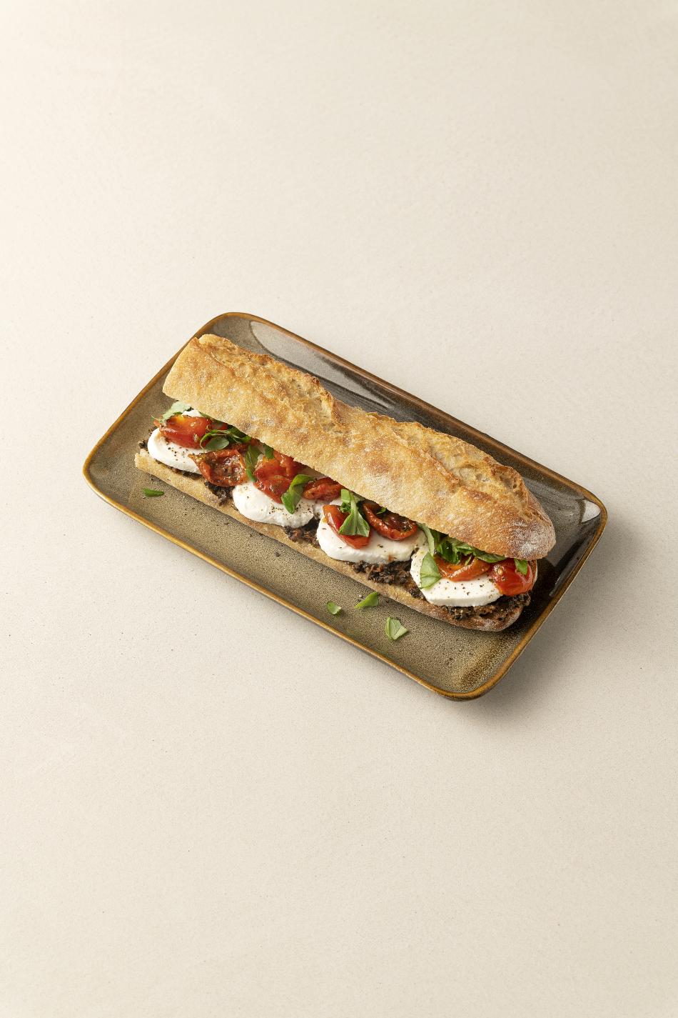 Baguette 48% (WEIZEN, GERSTE), Mozzarella 24% (pasteurisierte KUHMILCH, tierisches Lab), kandierte Tomaten 12%, schwarze Oliventapenade 10% (schwarze Oliven 75,9%, Rapsöl 12%, 6% Pfeffer, 6% getrocknete Tomaten (halbgetrocknete Tomaten, Rapsöl, Zitronensäure, Natriumbenzoat)), leichte Vinaigrette (SENF)