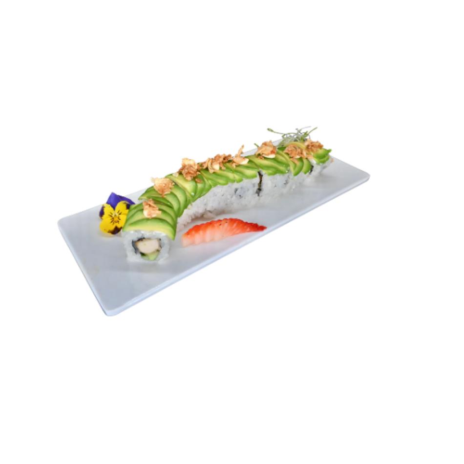 Sushi-Reis, Nori, Hähnchen-Tempura, Gurke, Avocadoscheiben obendrauf, Röstzwiebeln/Tempura-Flocken