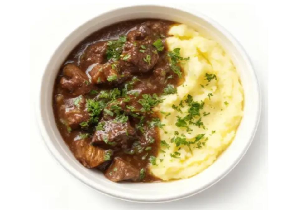 Kartoffelpüree 54,80 % (Kartoffeln, MILCH, BUTTER, Salz, Muskatnuss, Pfeffer), Boeuf Bourguignon 44,52 % (gewürztes Rindfleisch (Rindfleisch 23 % (EU), Rotwein (SULFITE), Wasser, verarbeitete Stärke, Salz, Pfeffer, Lorbeerblatt), Wasser, Rotwein (SULFITE), natürliche Aromen (SULFITE), Champignons, Zwiebeln, Karotten, geräucherter gekochter Speck (Schweinebauch, Salz, Glukosesirup, natürliche Aromen, Fermente), SELLERIE, destillierter Rotweinextrakt (SULFITE), verarbeitete Stärke, Salz, Tomatenpulver, aromatisches Karamell (Zucker, Wasser), Rapsöl, Schweineblutpulver, natürliches Knoblaucharoma, Kräuter der Provence, Verdickungsmittel: E 415), Petersilie. Kann Spuren von Gluten, Sesam, Nüssen, Ei, Fisch, Senf, Erdnüssen und Soja enthalten.