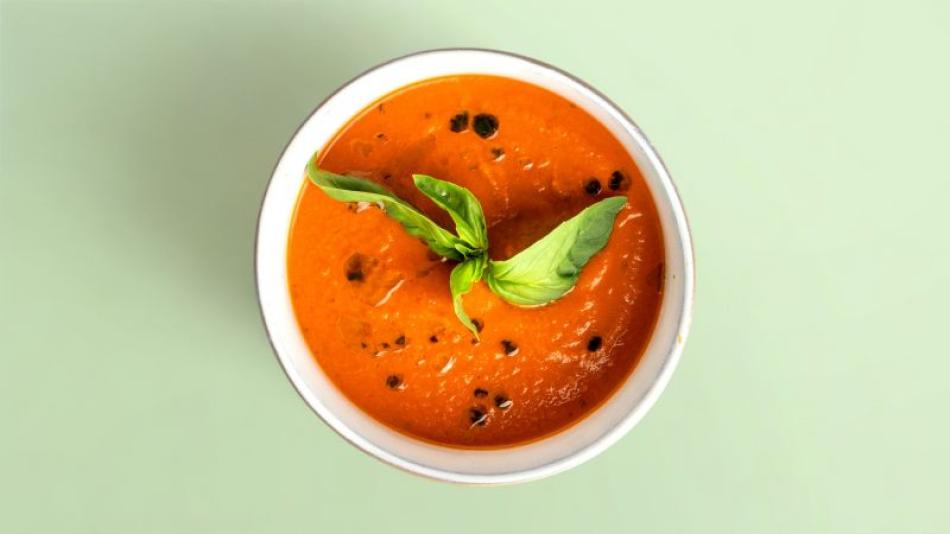 Gemischte Tomatensuppe mit Basilikum. – Glutenfrei. Für die perfekte Temperatur empfehlen wir, die Suppe 2–3 Minuten in der Mikrowelle zu erhitzen.