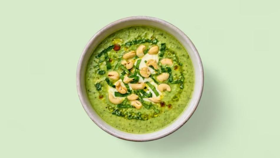 Zucchinisuppe mit frischem Ziegenkäse, Cashewkernen und Basilikum – Glutenfrei. Für die perfekte Temperatur empfehlen wir, die Suppe 2–3 Minuten in der Mikrowelle zu erhitzen.