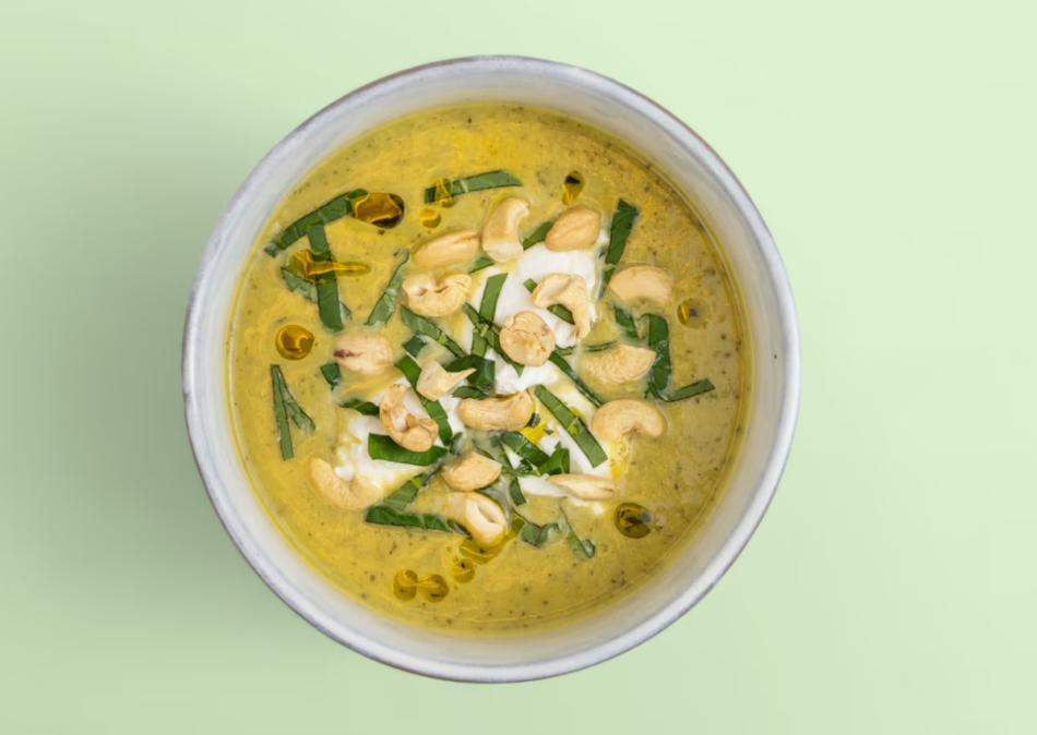 Zucchinisuppe mit frischem Ziegenkäse, Cashewkernen und Basilikum – Glutenfrei. Für die perfekte Temperatur empfehlen wir, die Suppe 2–3 Minuten in der Mikrowelle zu erhitzen.