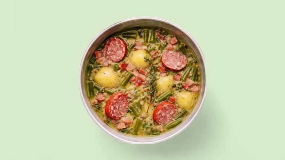 Traditionelle luxemburgische Suppe mit grünen Bohnen, Lauch, Zwiebeln und Kartoffeln – Glutenfrei. Für die ideale Temperatur empfehlen wir, die Suppe 2–3 Minuten in der Mikrowelle zu erhitzen.