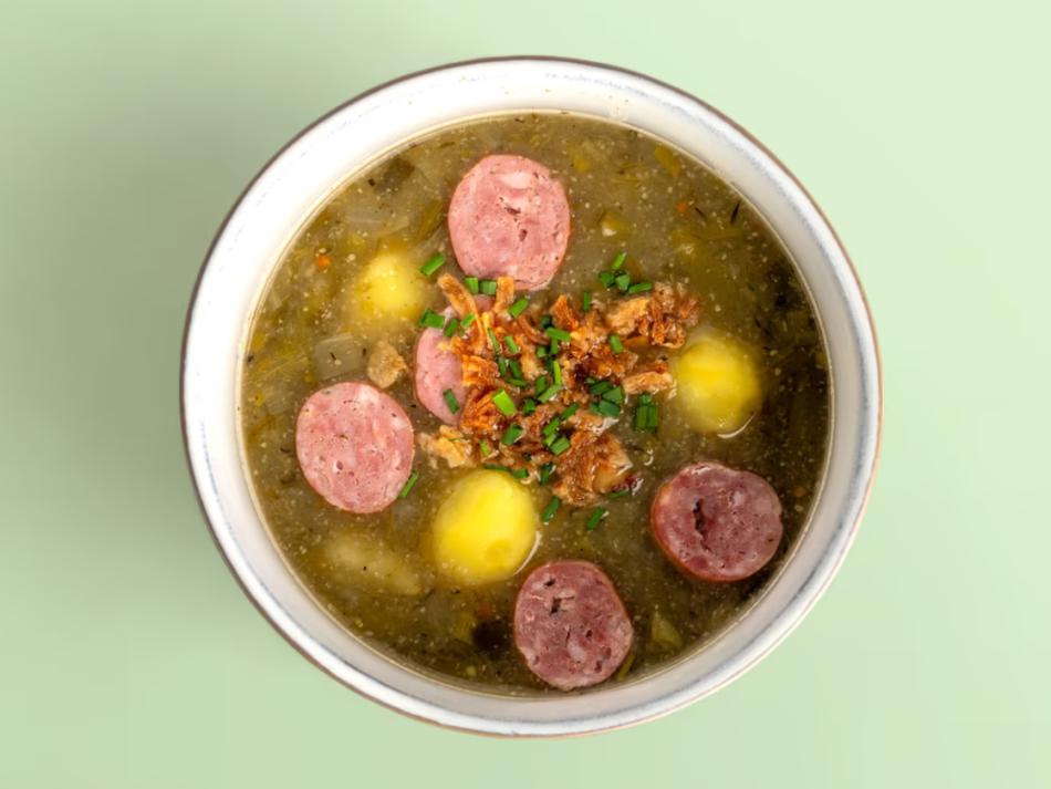 Traditionelle luxemburgische Suppe mit grünen Bohnen, Lauch, Zwiebeln und Kartoffeln – Glutenfrei. Für die ideale Temperatur empfehlen wir, die Suppe 2–3 Minuten in der Mikrowelle zu erhitzen.