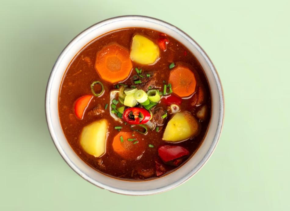 Traditionelle ungarische Suppe mit Rindfleisch-, Zwiebel- und Paprikaragout – Glutenfrei. Süßes Paprikapulver, scharfes Paprikapulver. Für die ideale Temperatur empfehlen wir, das Gericht 2–3 Minuten in der Mikrowelle zu erhitzen.