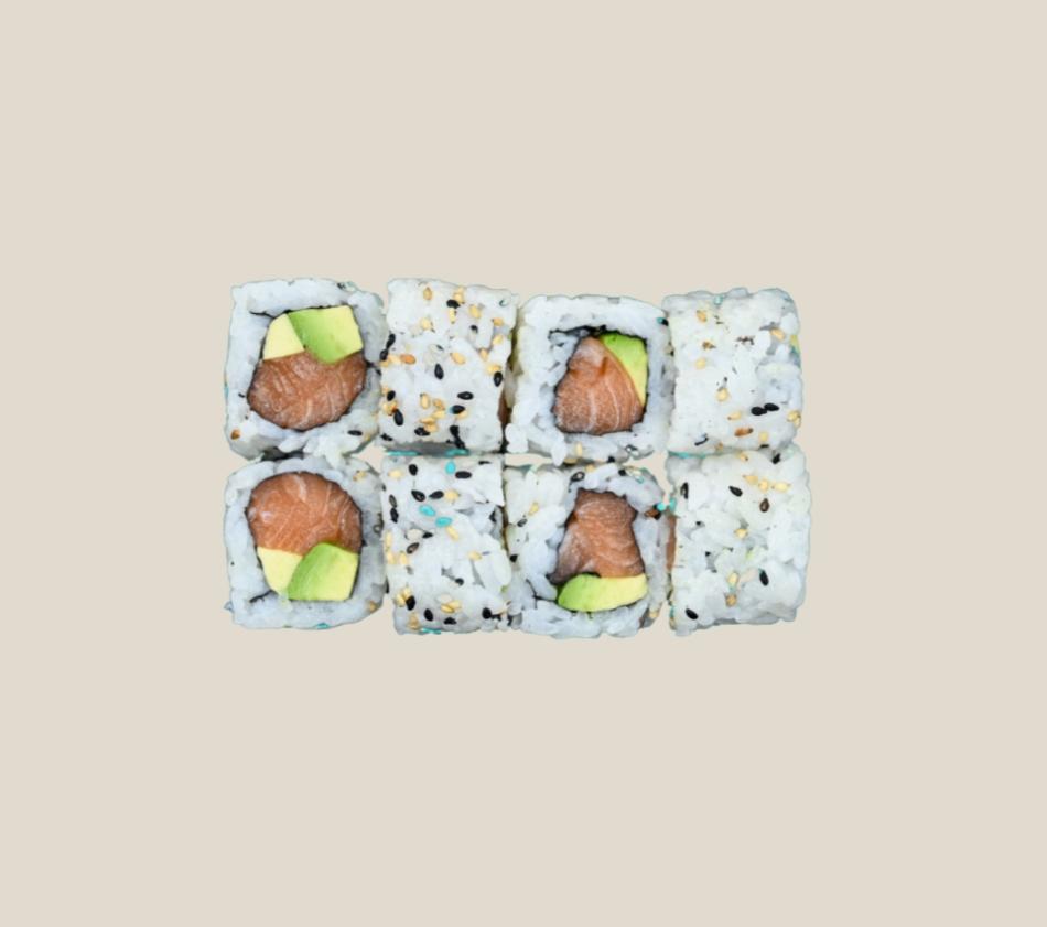 Avocado, Lachs und Reis. Gratis: 1 gesalzene Sojasauce, 1 Ingwerwurzel, 1 Wasabiwurzel.