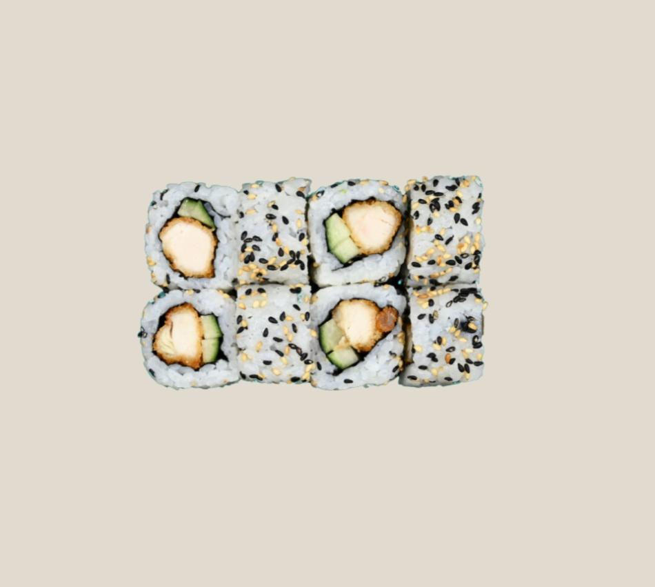 Avocado, Hähnchen, Reis, Algenhaut. Gratis: 1 gesalzene Sojasauce, 1 Ingwer, 1 Wasabi.