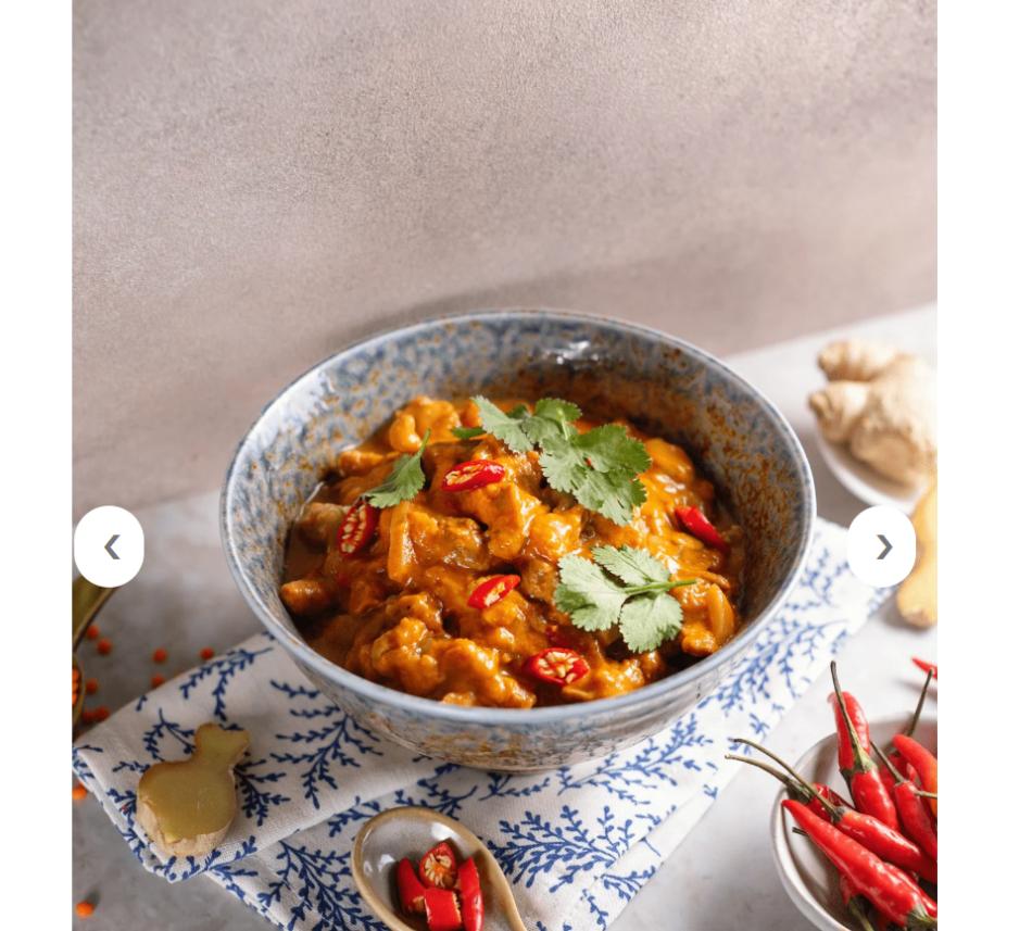 Trinkwasser, gegarte Hähnchenbruststreifen 26% (Hähnchenbrustfilet, Rapsöl, Speisesalz), Kokosnussmilch 8,7% (Kokosextrakt, Trinkwasser), Paprika, Zwiebeln, Bambusstreifen (Bambussprossen, Trinkwasser, Säuerungsmittel: Citronensäure), Tomatenmark, Fava Bohnen, Kürbiskerne, Rote Linsen, Maisstärke, Apfelsaftkonzentrat, Ingwer, Knoblauch, Currypaste rot 0,39% (getrocknete rote Chilis, Zitronengras, Knoblauch, Schalotten, Speisesalz, Kaffernlimettenschale, Galgant), Rapsöl, Speisesalz, Karotten, Sonnenblumenöl, Gewürze (enthält Senfmehl), Kräuter, Branntweinessig, Currypulver 0,19%, Verdickungsmittel: Guarkernmehl.