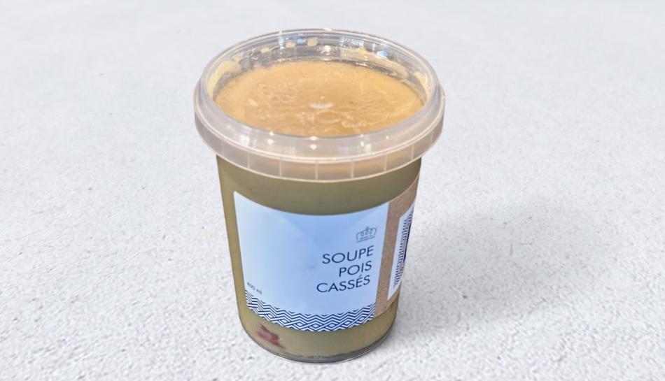 Wasser, Erbsen, geräucherte Wurst (Schweine- und Rindfleisch, Speck, Salz, Gewürze, Zucker), Gemüse (Lauch, Karotte, Zwiebel), Schinken, Würzmischung, Fleischbrühe, Butter, Salz, Gewürze