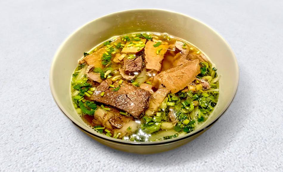 Reisnudeln, frische Kräuter, Sojasauce, Zwiebeln, langsam gegartes Rindfleisch.