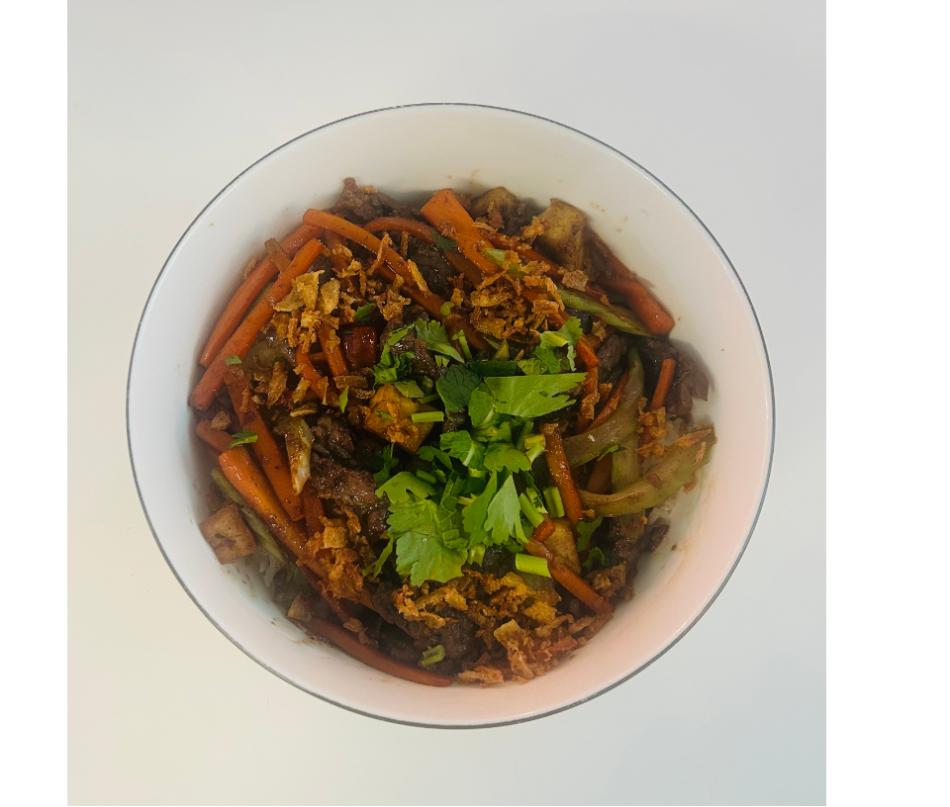 Weißer Reis, süße Sojasauce, gebratenes Rindfleisch und Gemüse, gebratener Tofu, Röstzwiebeln, Koriander.