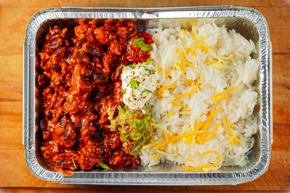 Gehacktes Rind-/Schweinefleisch, Zwiebeln, Knoblauch, Kreuzkümmel, Chili, Salsa, Kidneybohnen, Salz, Pfeffer, Petersilie, Crème fraîche, Jalapeno, geriebener Cheddar