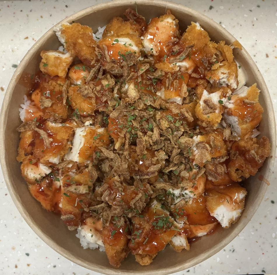 Duftender Reis, hausgemachte süß-saure Soße, knuspriges Halal-Hähnchen, Röstzwiebeln, süße Chilisauce.