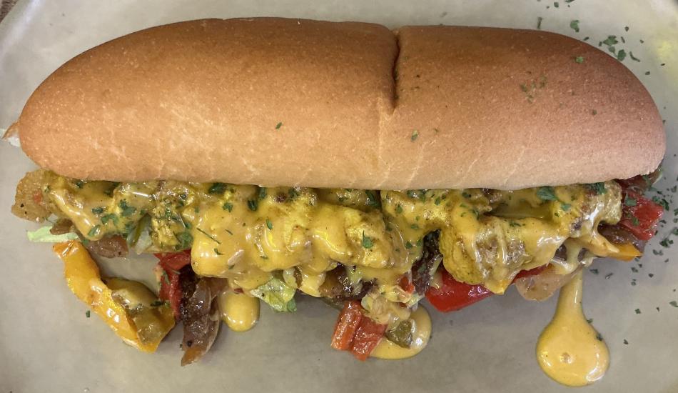 Briochebrötchen, Frischkäse, karamellisierte Zwiebeln, geröstete Paprika, Rindfleischscheiben, Rinderbacon, Cheddar-Käse, hausgemachte BBQ-Sauce.