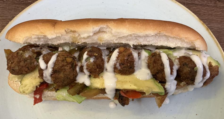 Briochebrötchen, Frischkäse, karamellisierte Zwiebeln, geröstete Paprika, Avocado, Falafel, hausgemachte weiße Sauce mit griechischem Joghurt.