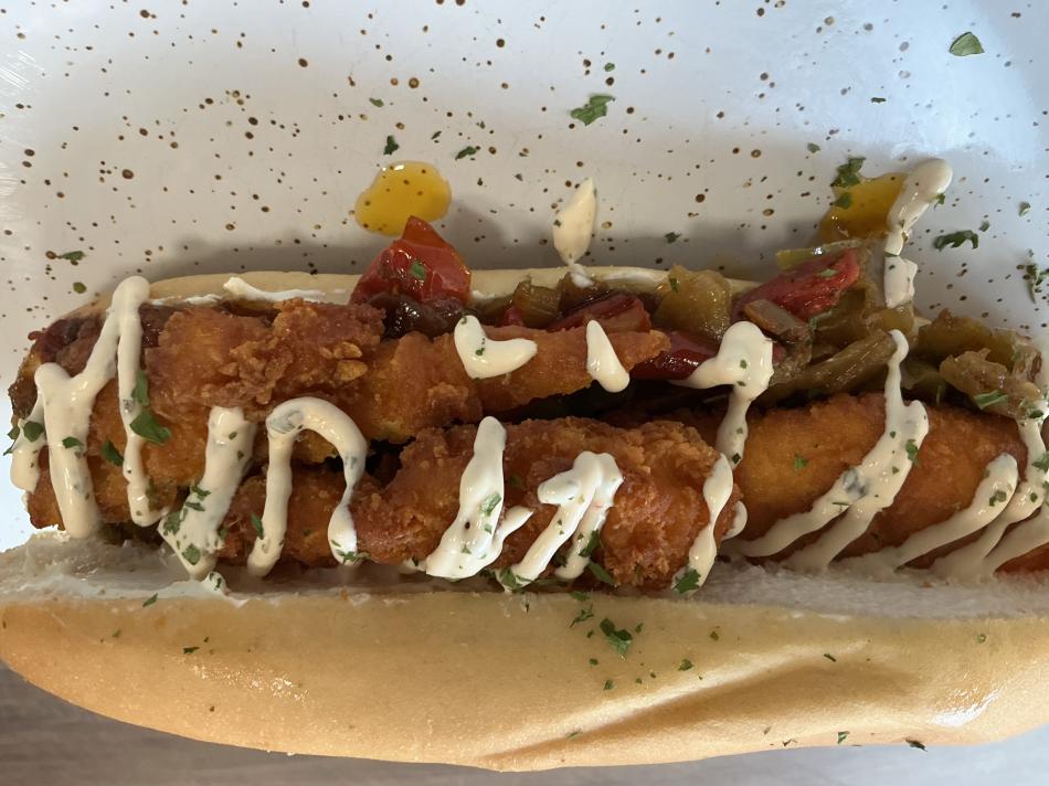 Briochebrötchen, Frischkäse, karamellisierte Zwiebeln, geröstete Paprika, knuspriges Hähnchen, hausgemachte süß-saure Sauce.