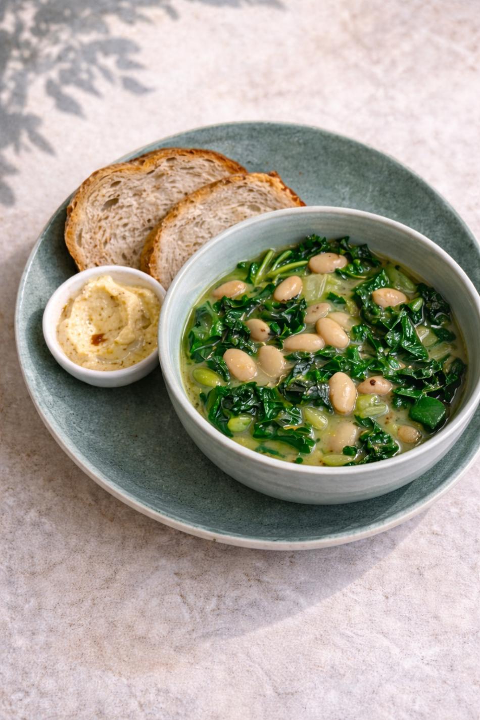 Mit Brot und Hummus.