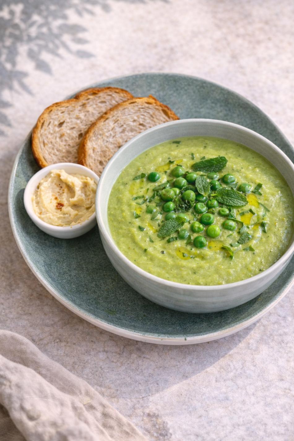 Tagessuppe – Grüne Erbsen-Minz-Suppe, serviert mit Brot und Hummus