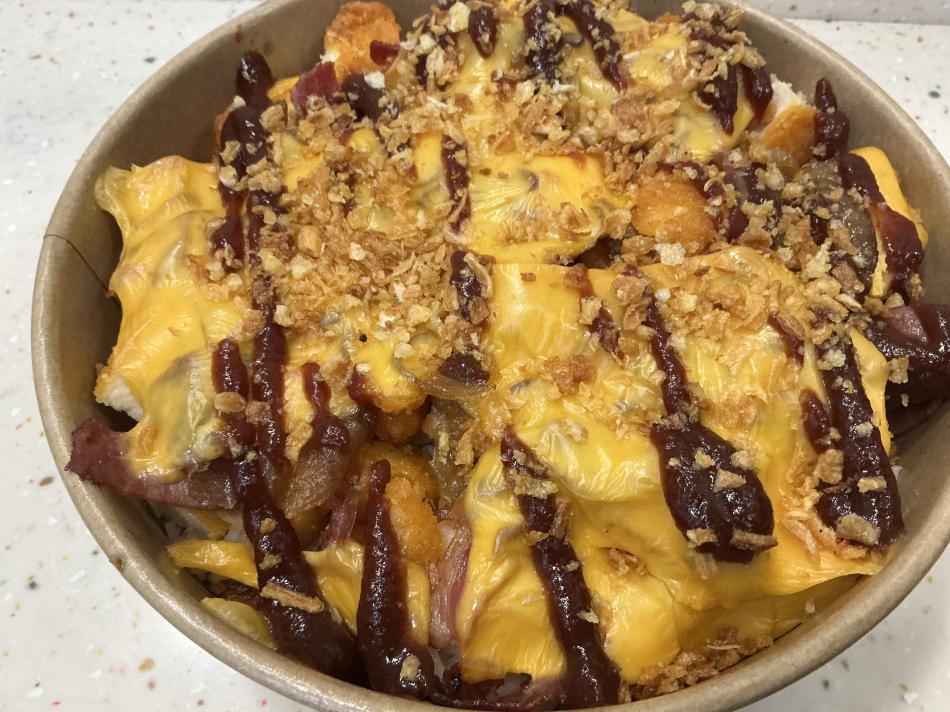 Duftender Reis, Zwiebelsauce, knuspriges Hähnchen, geräucherte Specksauce, Halal-Räucherspeck, Cheddar-Käse, Röstzwiebeln, Barbecue-Sauce.