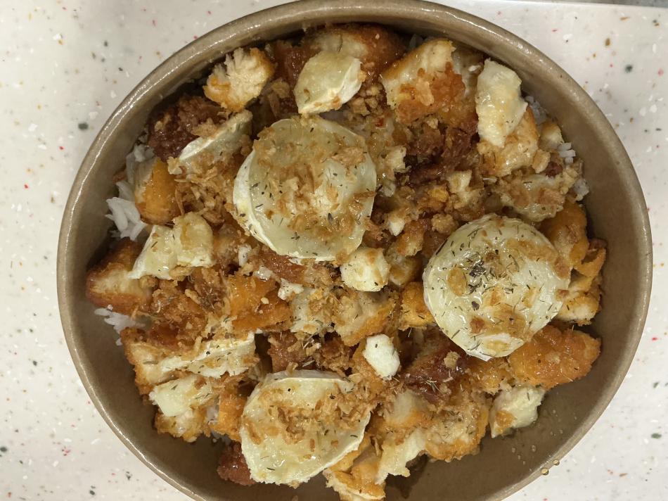 Duftender Reis, Zwiebelsauce, knuspriges Hähnchen, Ziegenkäse, Röstzwiebeln, Honig, Thymian