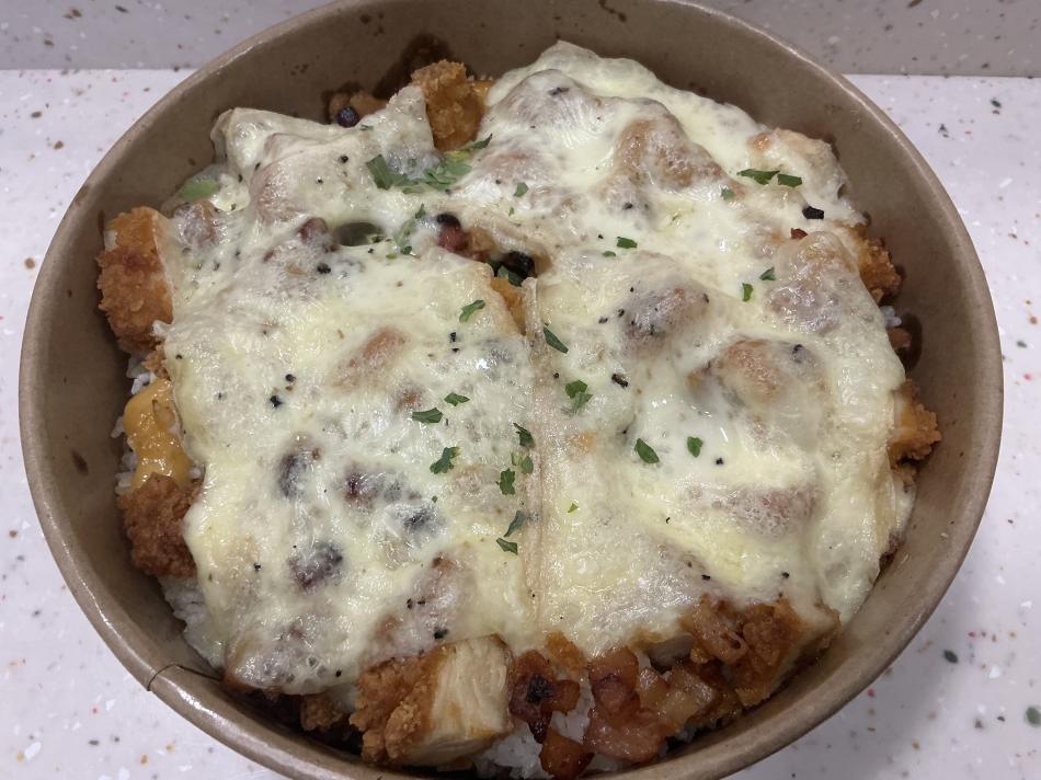 Duftreis, Zwiebelsauce, knuspriges Hähnchen, geräucherter Speck, Röstzwiebeln, Raclettekäse