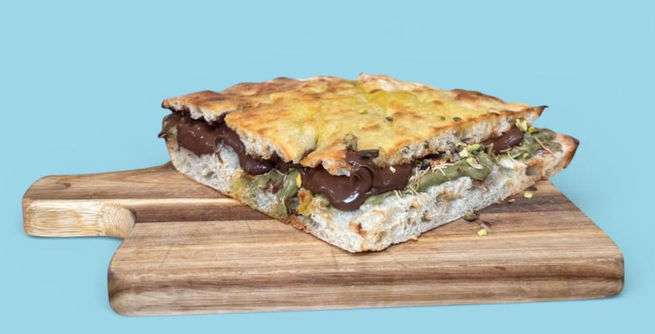 Genießen Sie unsere Schiacciata Pistazie: ein süßes Sandwich gefüllt mit Mascarpone und unserer hausgemachten Pistaziencremesauce.