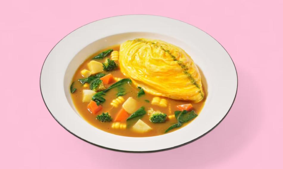 Japanischer Omelett-Reis, serviert mit einer würzigen Gemüsecurrysauce