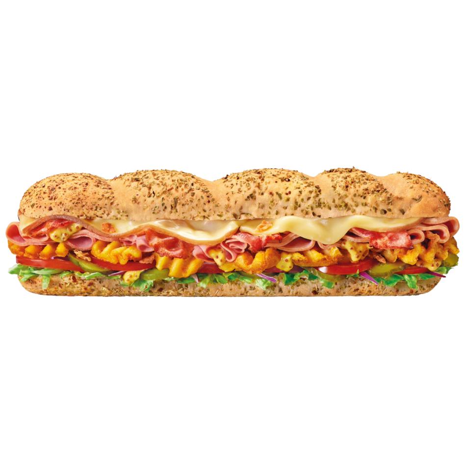 Schinken, Speck, Waffelpommes, Raclettekäse mit Essiggurken, Röstzwiebeln, Salat, Tomaten, roten Zwiebeln und Sauce nach Wahl (Honig-Senf-Sauce empfohlen). Der saftigste Sandwich-Klassiker ist zurück! Jetzt zugreifen!