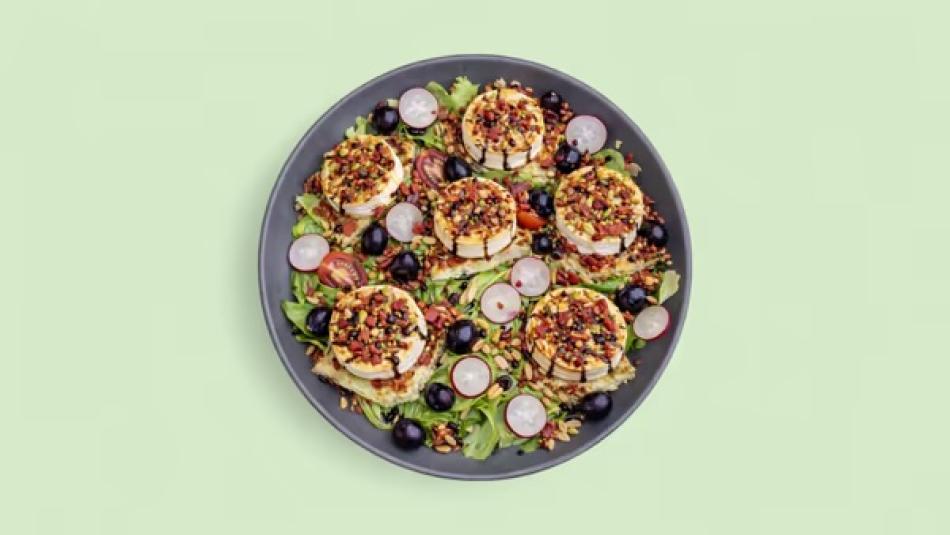 Römersalat, Kirschtomaten, Pinienkerne, Walnüsse, rustikales Brot, Radieschen, Paprika, Ziegenkäse in Rollenform, knuspriger Speck, Balsamico-Vinaigrette