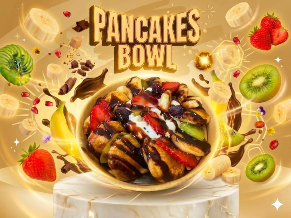 Mini-Pfannkuchen, Früchte, griechischer Joghurt, Chiasamen, Schokoladensoße. Allergene: Gluten, Ei, Milch, Sulfite.