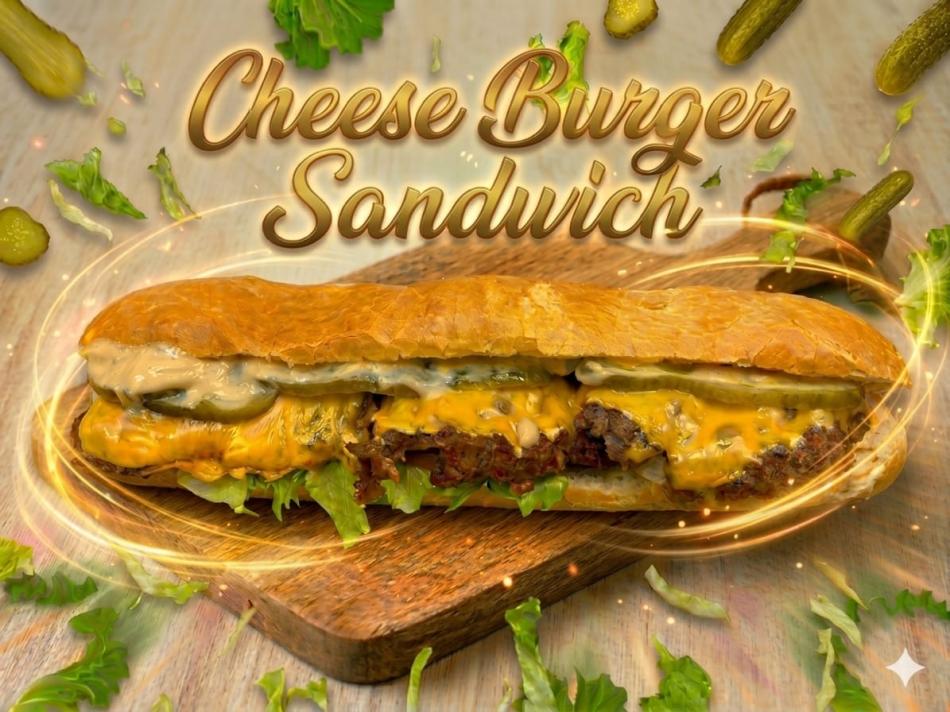 Halbes Baguette, Zwiebelsauce, Salat, Tomate, Rindfleisch, Cheddar-Käse, Gewürzgurke.