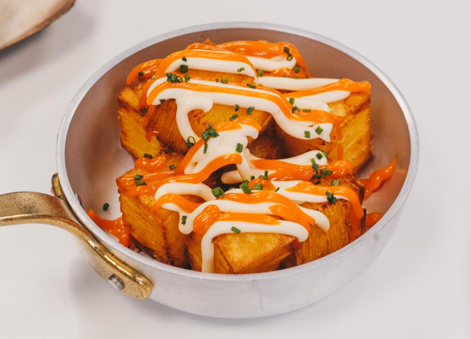 Goldbraun gebratene Kartoffelwürfel, innen weich, serviert mit Aioli und einer Yemmy-Sauce nach Wahl.