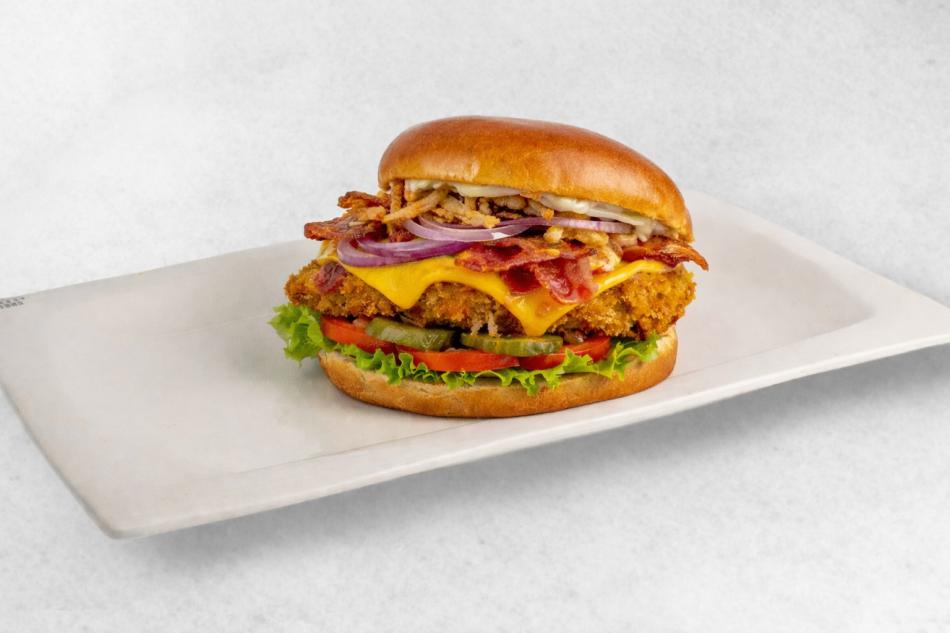 Knusprige Chicken Tenders, Speck, Cheddar, Salat, Tomate, rote Zwiebeln, Röstzwiebeln, Gurken, Burgersauce, Brioche-Brötchen
