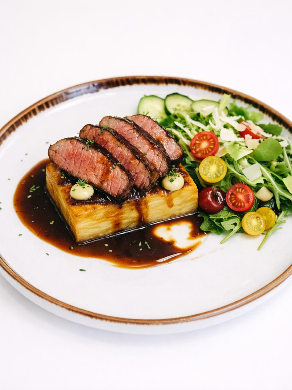 Geschnittenes Rindfleisch, knuspriges Kartoffel-Millefeuille, braune Jus, frischer Salat