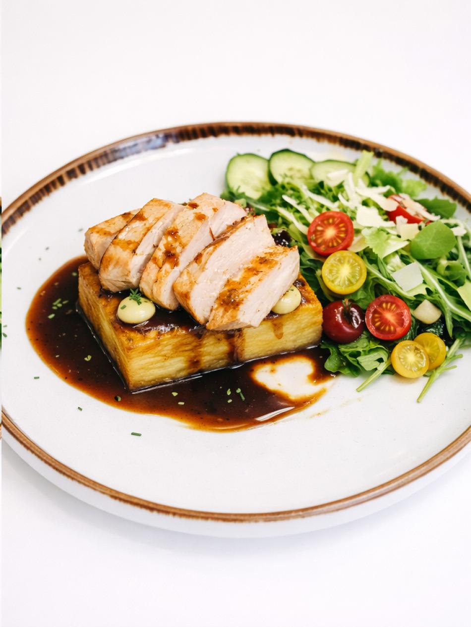 Geschnittenes Hähnchen, knuspriges Kartoffel-Millefeuille, braune Jus, frischer Salat