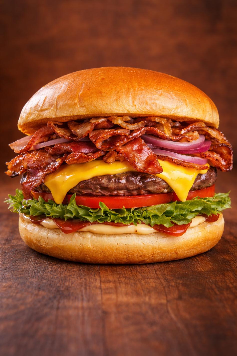 Rindfleisch 200g, Bacon, Serrano-Schinken, Cheddar, Römersalat, Tomate, rote Zwiebeln, Röstzwiebeln, Gewürzgurken, BBQ-Sauce, Burgersauce, Brioche-Brötchen