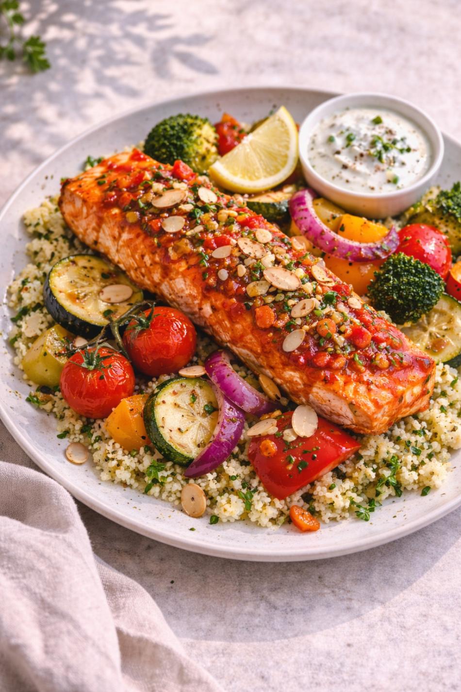 Tagesgericht – In roter Paprikasauce marinierter Lachs, serviert mit Couscous, mediterranem Gemüse und Mandeln
