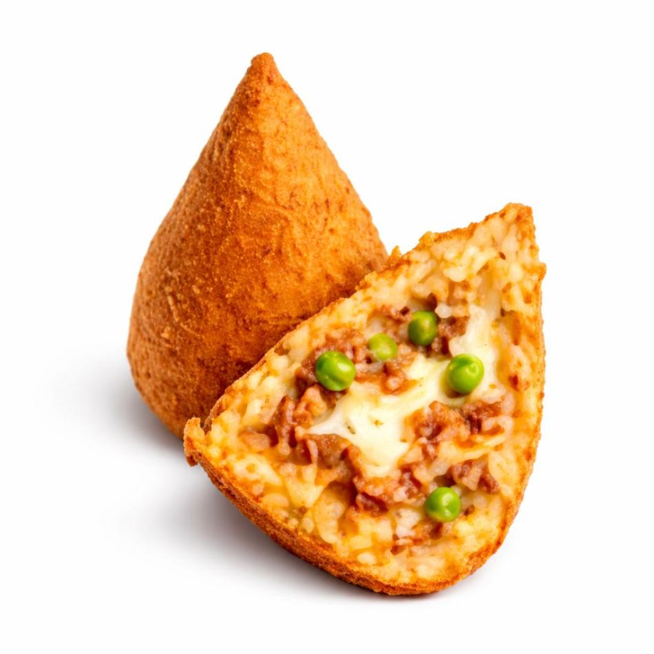 Reisbällchen mit Tomate, Erbsen, Mozzarella, Rind- und Schweineragù
