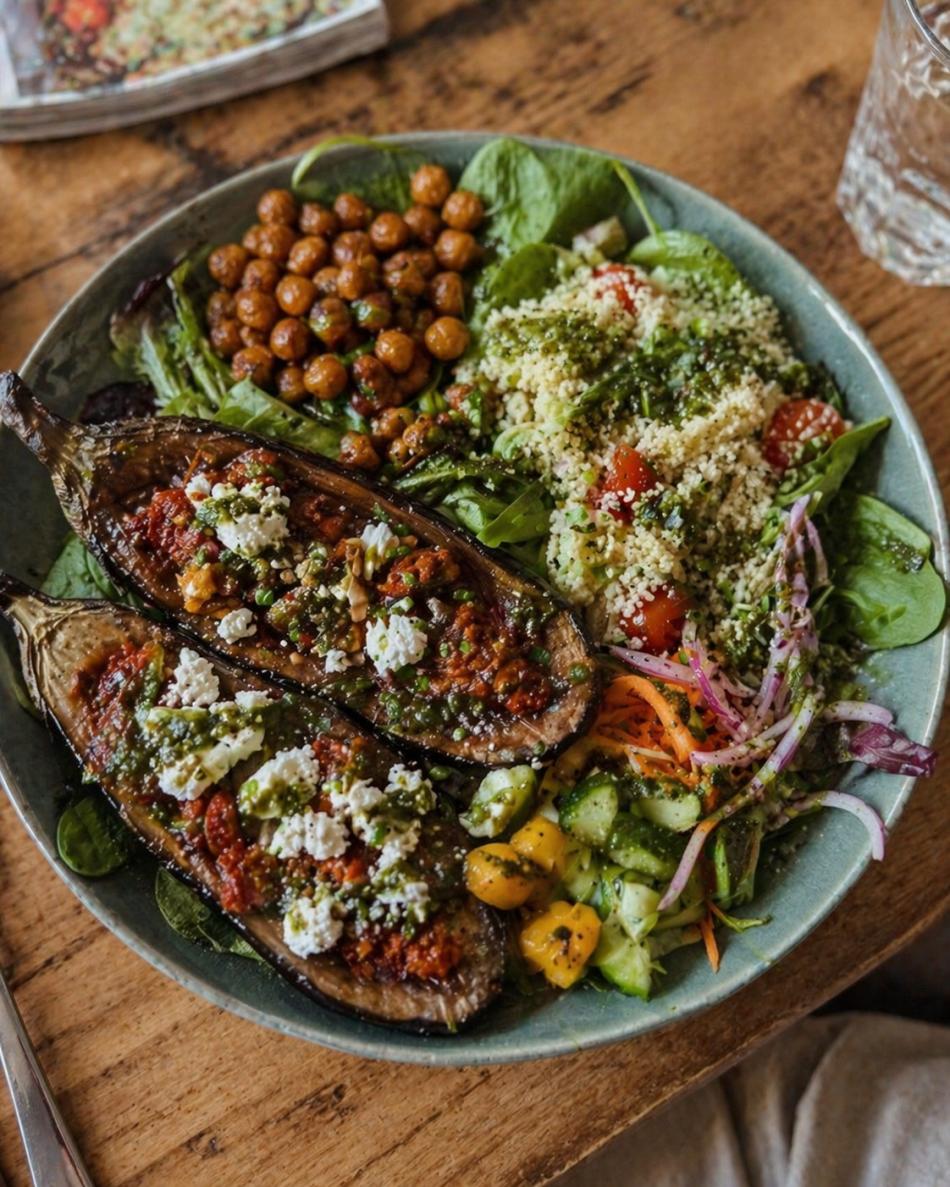 Mit rotem Pesto und Feta gefüllte Aubergine, serviert mit Couscous-Salat, gerösteten Kichererbsen und Zitronen-Minz-Dressing