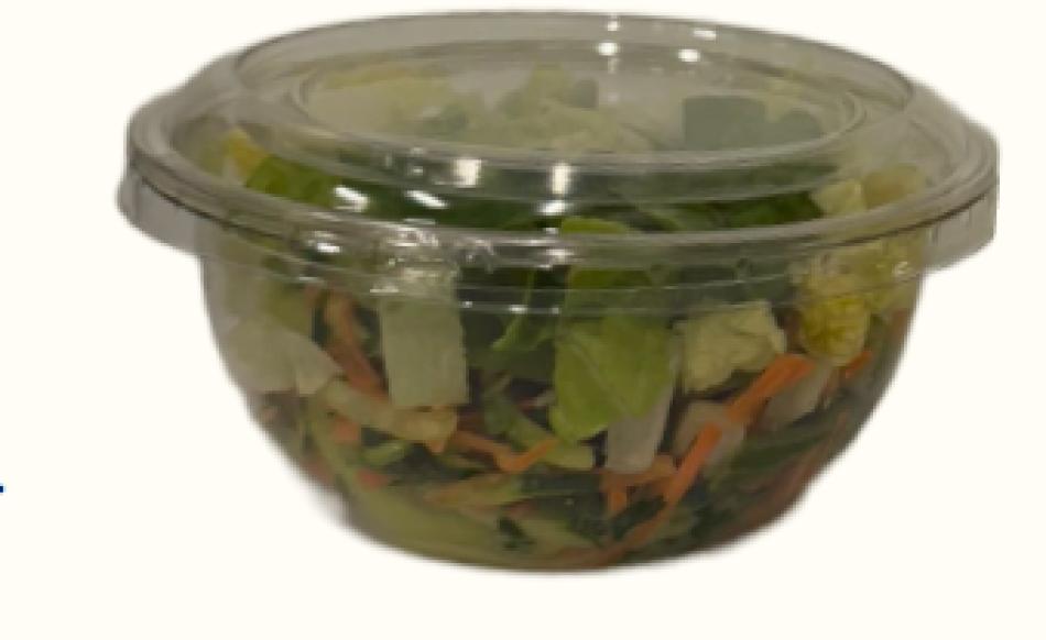 Gemischtes Gemüse (grüne Bohnen 22,74 %, Zucchini 18,2 %, Karotten, Äpfel 9,1 %, Dressing (Himbeeressig (Rotweinessig, natürliches Himbeeraroma, Sulfite), Rapsöl, Senf (Wasser, Senfkörner, Weißweinessig, Salz, Zucker, Gewürze)), Weintrauben, Schnittlauch, Koriander, Minze), Blattsalat.
