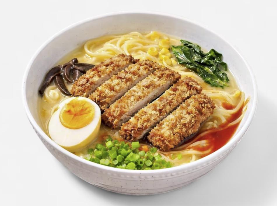Tonkotsu-Brühe, Udon-Nudeln, knusprige Ente, mariniertes, weichgekochtes Ei, Mais, Wakame, Mu-Err-Pilze und Frühlingszwiebeln