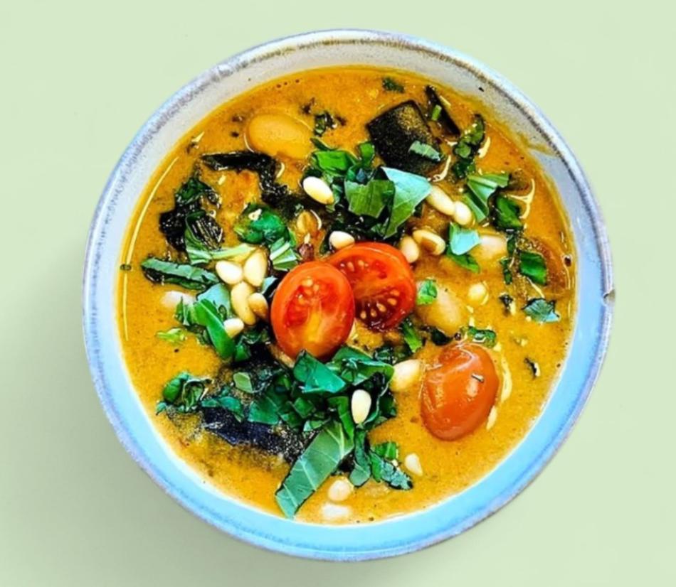 Auberginen, Tomaten, weiße Bohnen, Kokosmilch, Pinienkerne