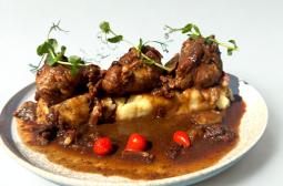 Schweinefleisch-Tenders mit Kartoffelpüree +/- 480 gr. bei Niedrigtemperatur nach Bourguignon-Art mit ReisLieferung: