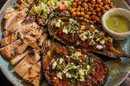 Hauptgericht des Tages - Hähnchen und Aubergine gefüllt mit rotem Pesto und FetaLieferung: